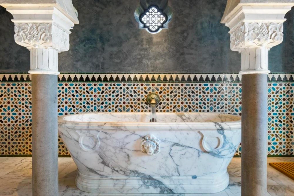 Evin geri kalanındaki süslü tasarımlar, hamam esintili bir ihtişam için mermer küveti çerçeveleyen dev Korint sütunlarıyla banyoda da devam ediyor.