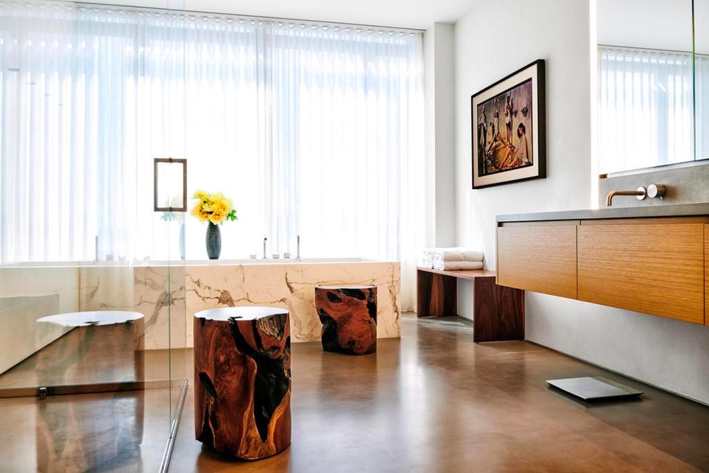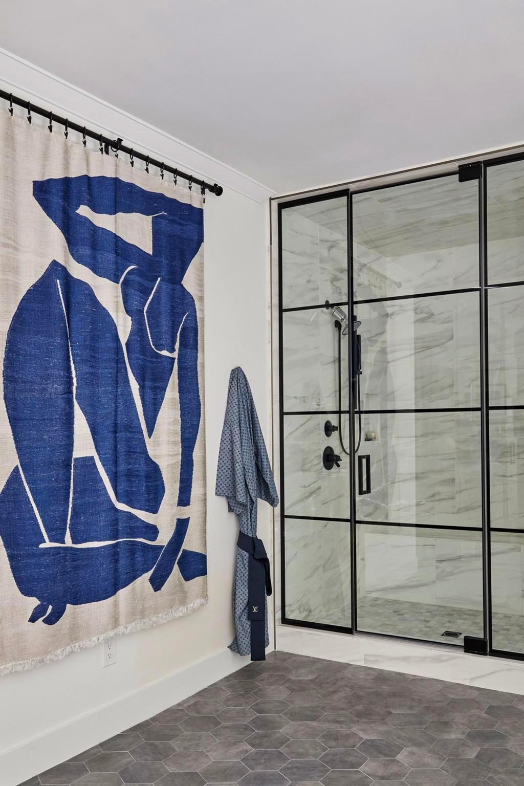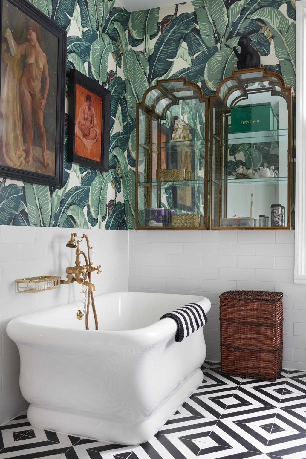 duvar kağıdı, bu tuvalet odasının geri kalan tasarımının ilham kaynağıydı. Miley'nin annesi ve tasarımcısı Tish, "Miley bana bu banyoda olduğunuzda bunun bir deneyim olması gerektiğini söylemişti," diyor. "Biraz korkmuştum ama her şeyi göze aldık. At kılı apliklerin son rötuşlarını yaptığımızda, Vay canına, işe yarıyor ve harika oldu," dedik. 1970'lerden kalma pirinç ve Murano cam ayna, Waterworks'ten bir Isla musluğuyla tamamlanan özel mermer bir makyaj masasının üzerinde asılı.