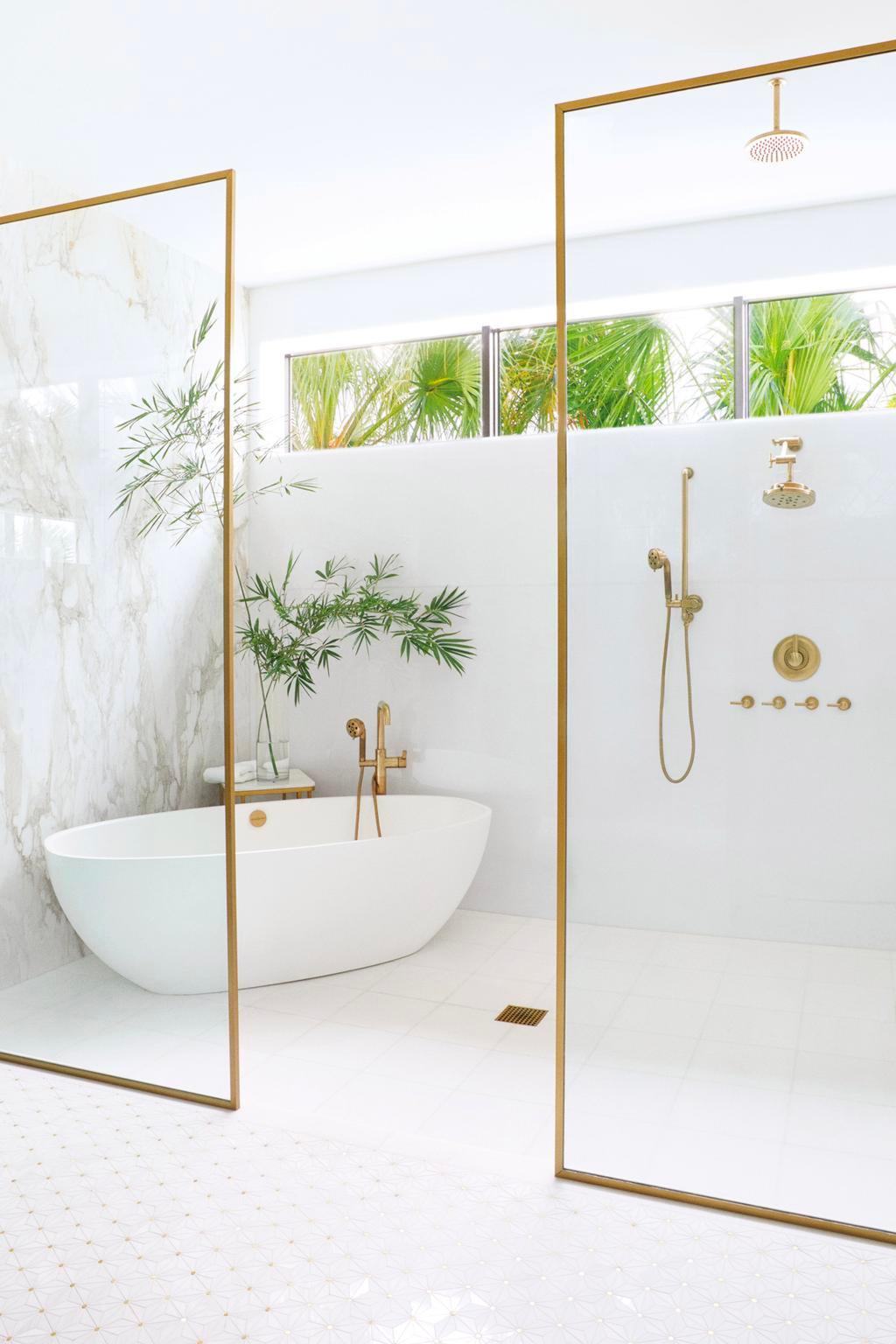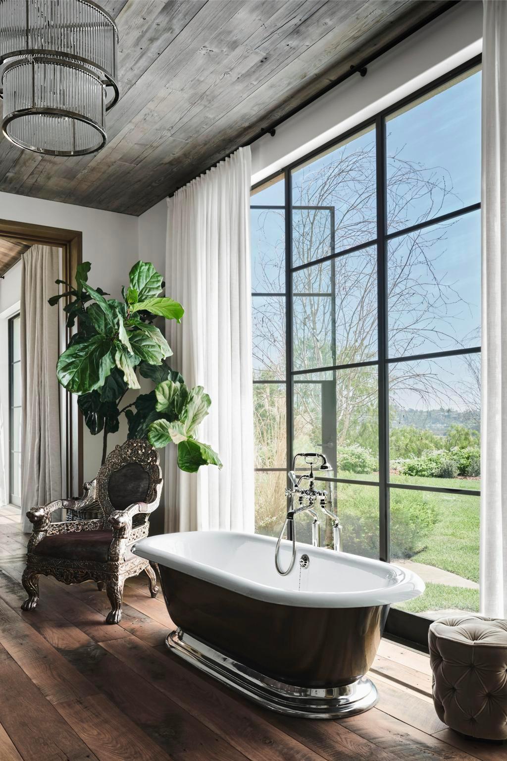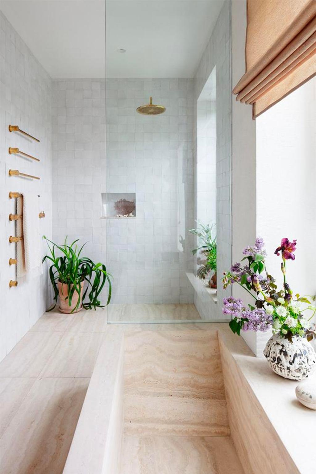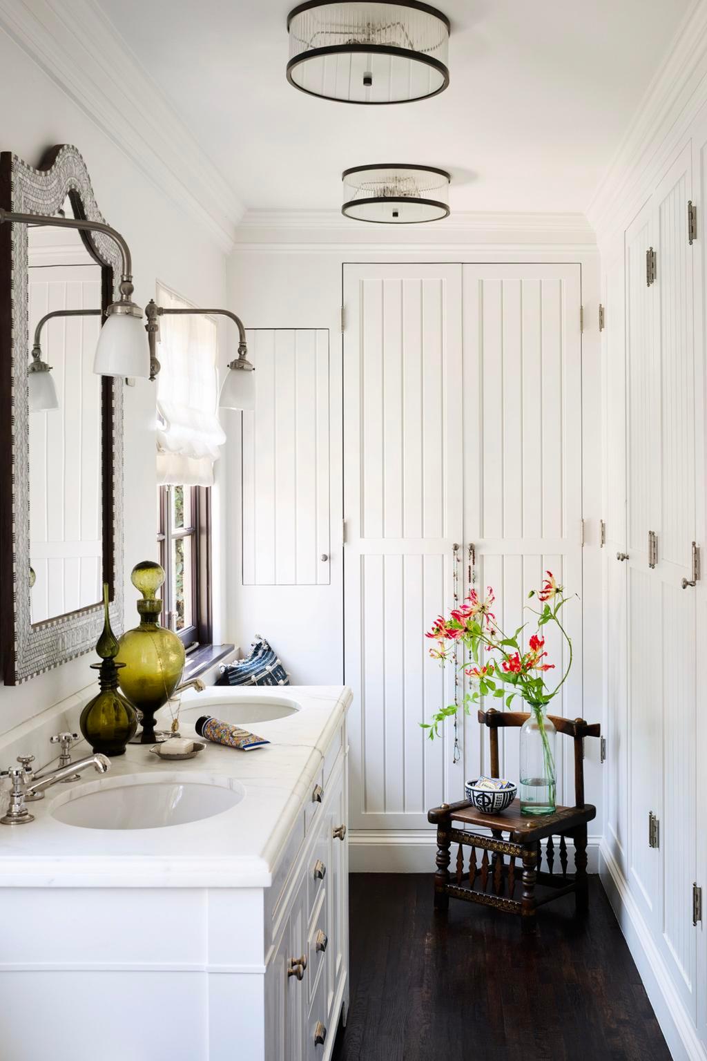 Roberts'ın "daha rahat detaylar" dediği şeyle yan yana getirmek anlamına geliyordu. Ana banyo Travertenle kaplı. Duşta Ann Sacks fayansı, Kallista duş başlığı; Vola havlu askıları; Shizue Imai'den seramik vazo.