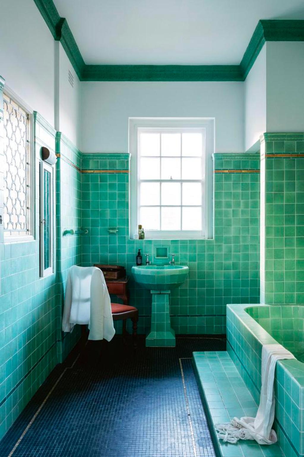 Ev 1928 civarında inşa edilmiş ve neredeyse hiç değiştirilmemiş. Zampatti tüm banyoları olduğu gibi bırakmış, [tıpkı] 20'lerin sonlarında olduğu gibi. Yeşil fayanslar odada sakinleştirici bir etki yaratıyor ve rengin bir alanı nasıl dönüştürebileceğinin bir kanıtı.