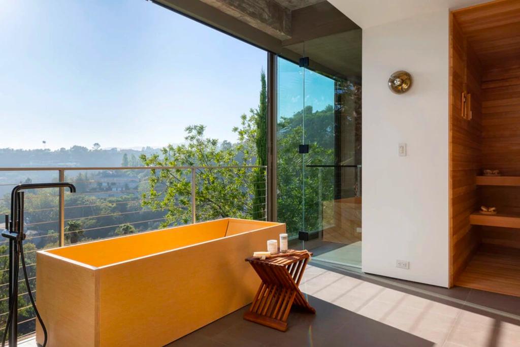 Sauna ve ahşap küvet içeren spa odası bu banyoyu gerçekten farklı kılıyor.