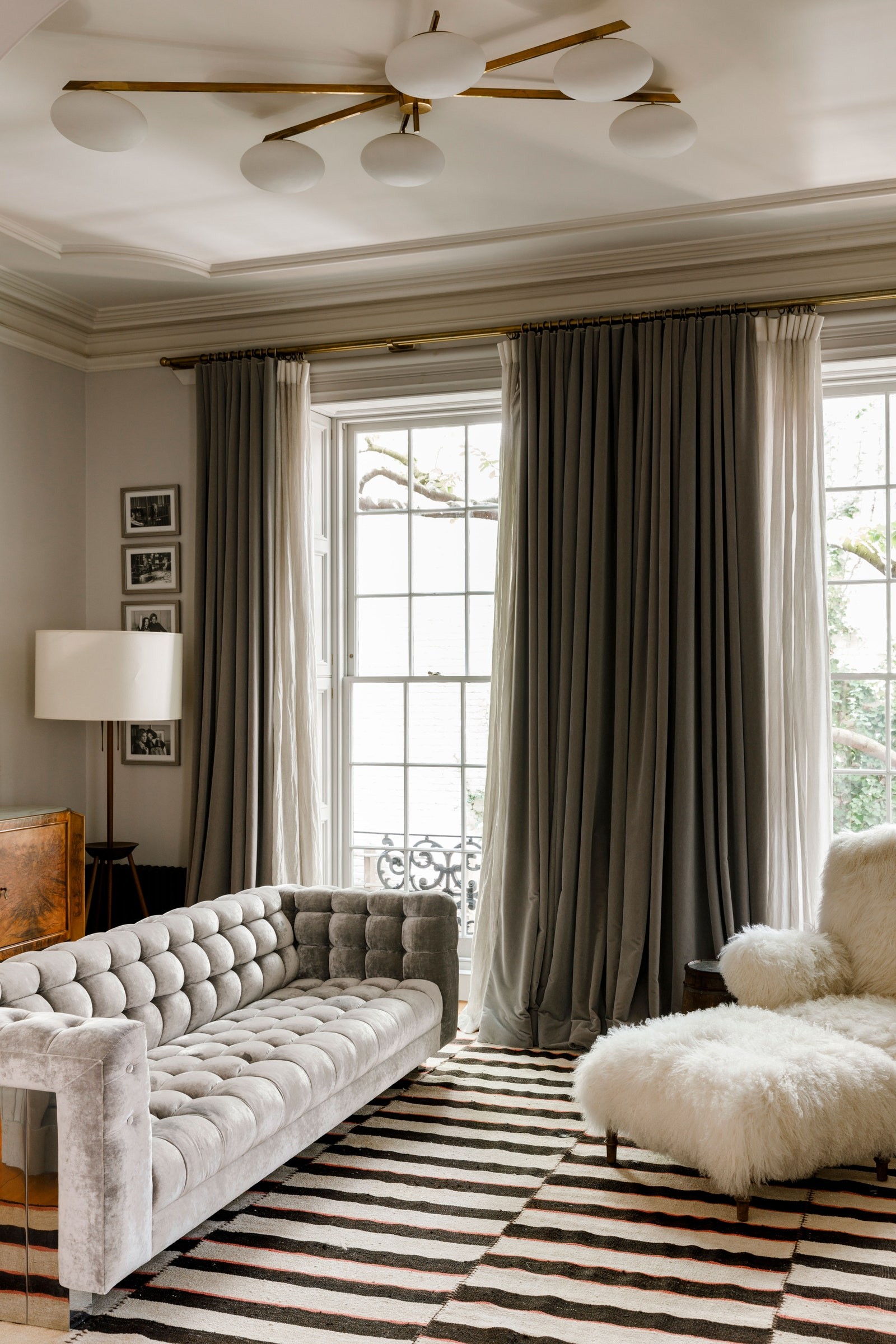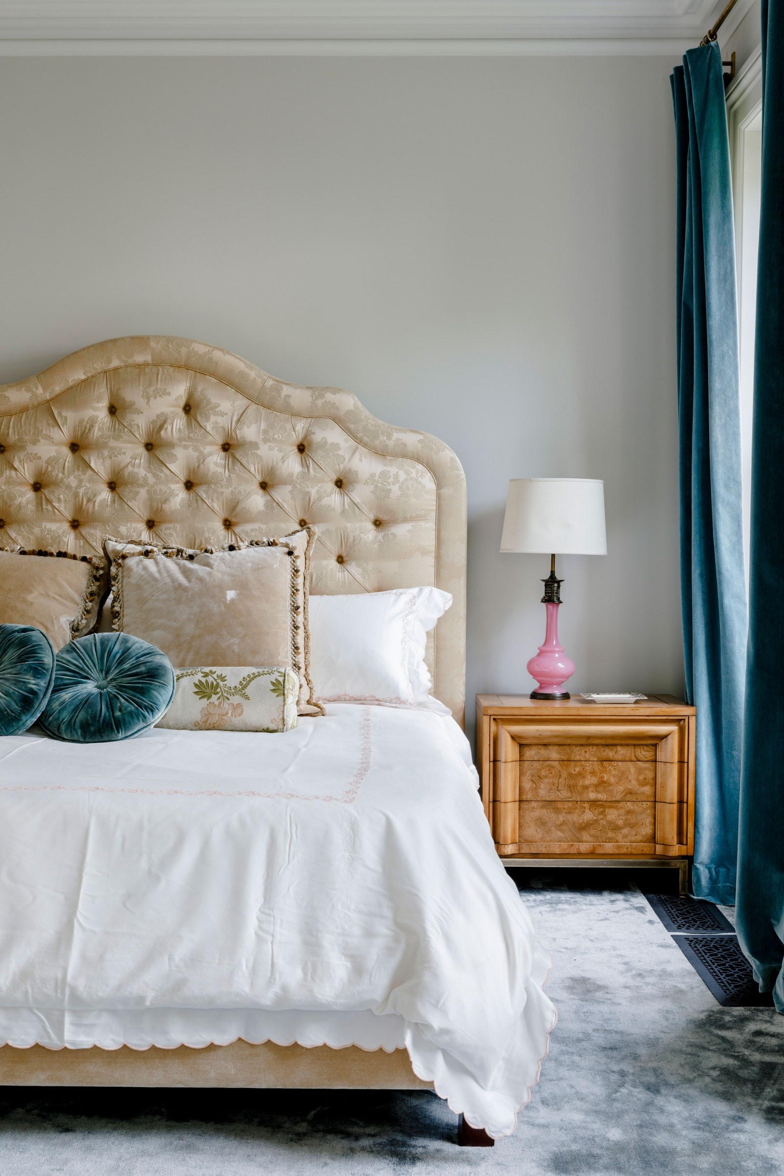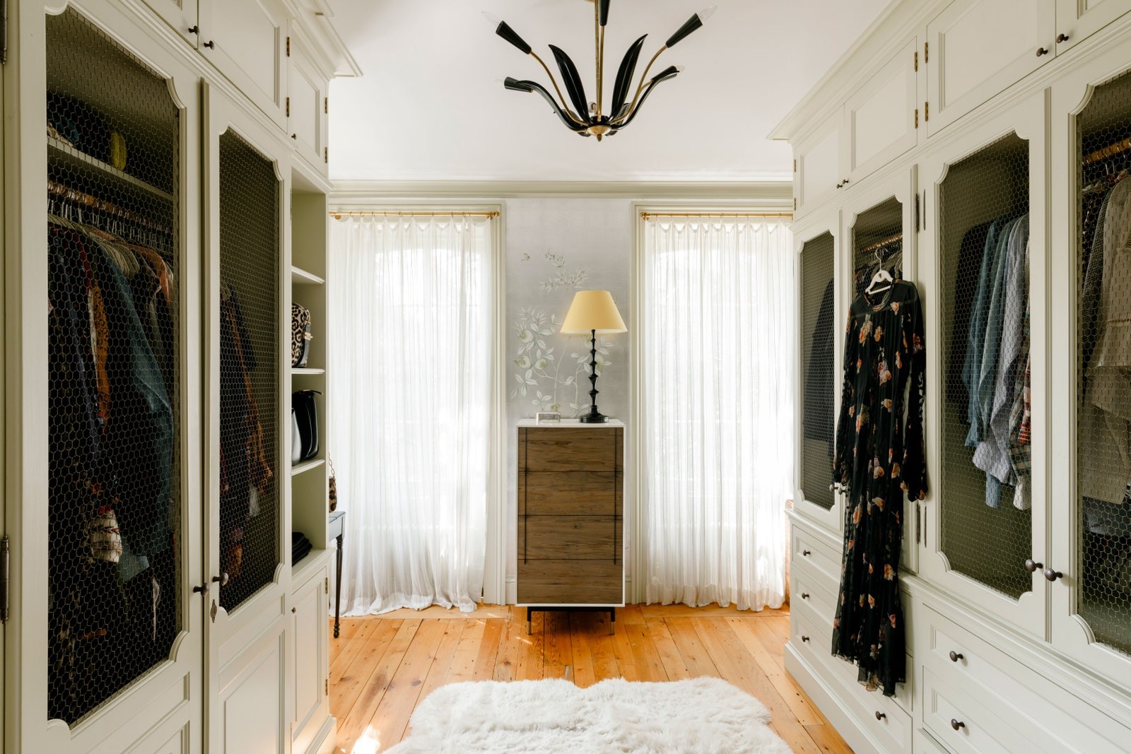 Üst katın tamamı, bu ışık dolu ve geniş gömme dolabı içeren bir ana süit olarak hizmet vermektedir. “Bu onun ve onun bir dolabı ama ben ikisini de ele geçirdim,” diyor Tyler. Kocası, İngiliz spor ajanı Dave Gardner (ve Tyler'ın en küçük çocuklarının babası Sailor ve Lula'nın), eşyalarının çoğunu Batı Londra'daki bir kasaba evinde diğer evlerinde tutar. Tavuk teli panelleri dolap kapılarının şeffaf kalmasını sağlar. “Başlangıçta tavuk telinin arkasına kumaş koyacaktık,” diyor Tyler. “Sonra taşındık ve çok hoşuma gitti, bu yüzden kumaşı asla koymadık. Odada küçük gizli çekmeceler ve eğlenceli küçük detaylar var.” Gümüş yaprak