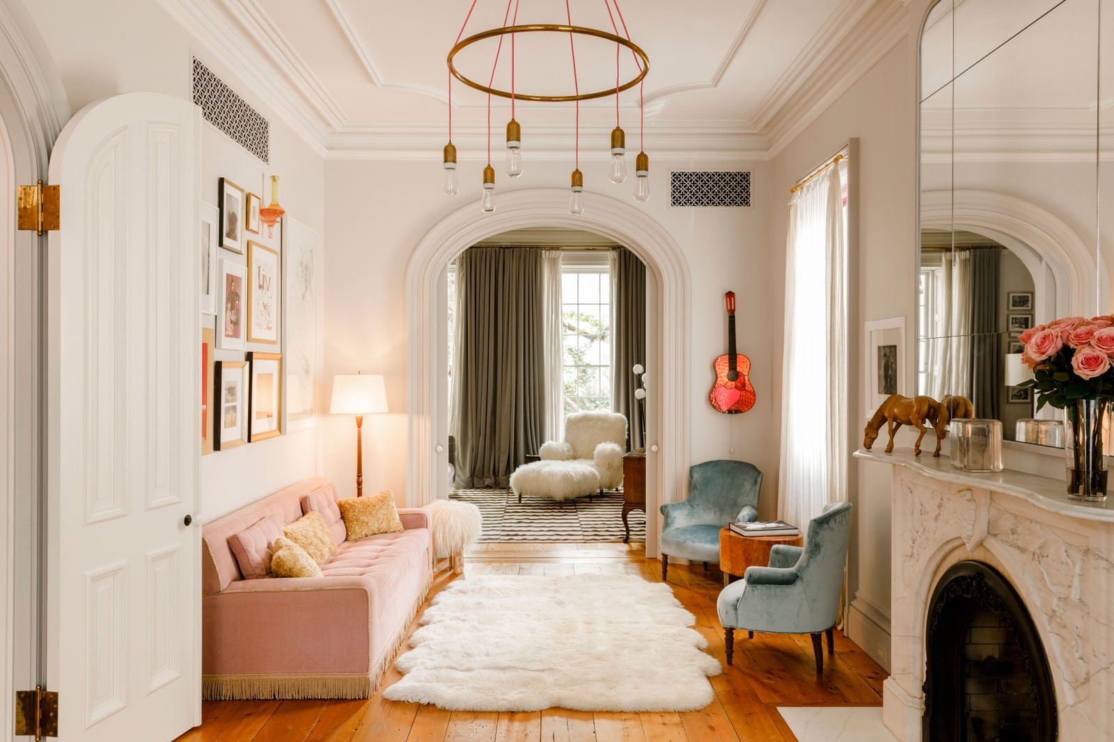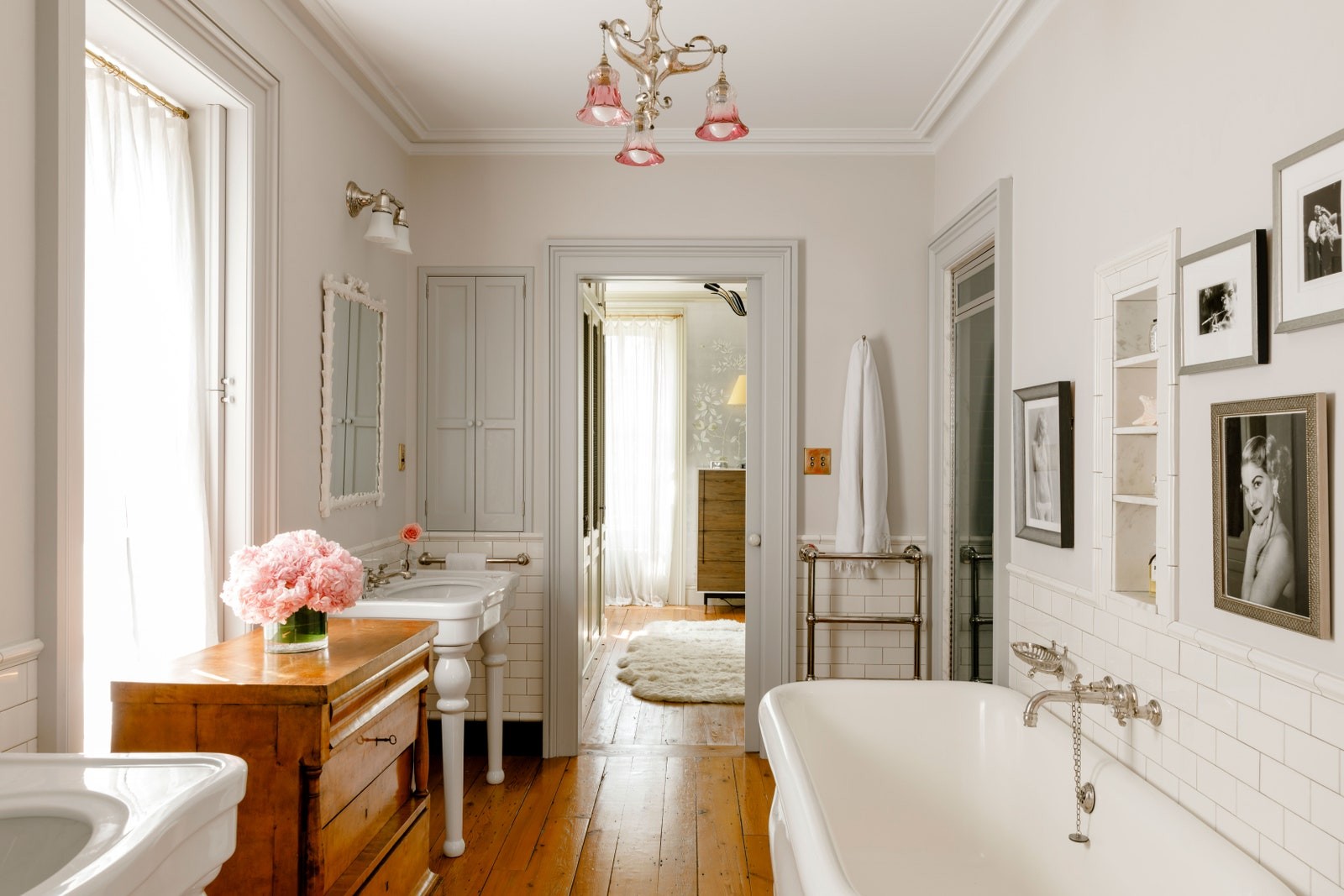 duvar kağıdı vintage de Gournay olduğunu. “Desenin alt kısmında bir Çin kırsalının görüntüleri var,” diye hatırlıyor Tyler. Sadece çiçek alabilmemiz için hemen üstüne kırptım. ” Tyler'ın ev boyunca asılı olduğu benzer parçalardan biri olan avize, vintage bir orta yüzyıl İtalyan tasarımıdır. Sağda asılı olan elbise de klasik.