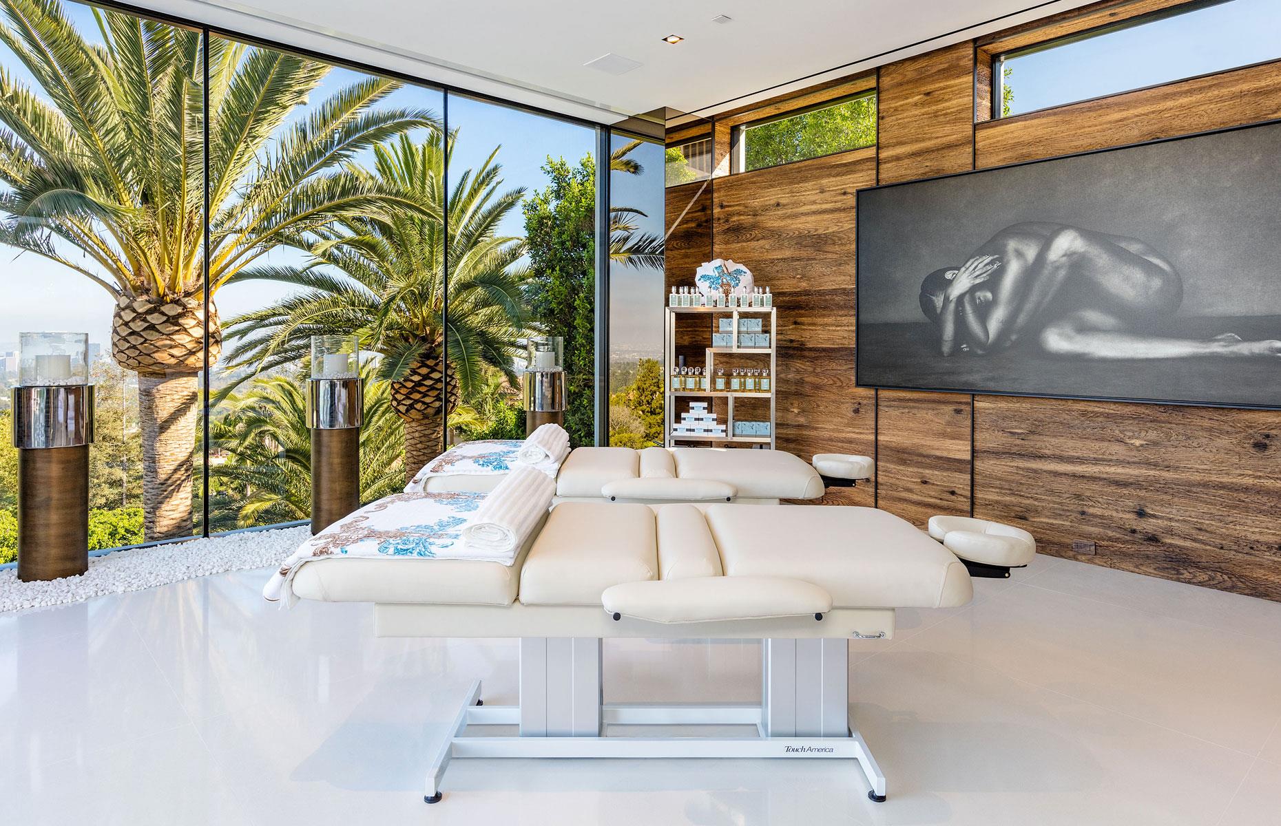 Gün ışığında, evin sağlıklı yaşam merkezi aydınlık ve ilham vericidir ve soğuk/sıcak dalma havuzu, buhar masaj odası ve saç şekillendirme olanaklarına sahip tam hizmetli bir güzellik salonu içerir. Pencere şeritleri Los Angeles şehir merkezinin muhteşem manzaralarını çerçeveler, ancak bakmak için bunlar yeterli değilse, 15 kişilik bir tiyatro ve bir gurme gösteri mutfağının yanı sıra iki ek bar da bulunmaktadır.