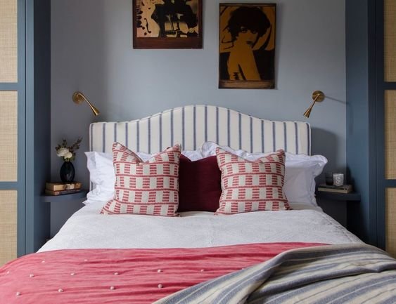 Yukarıda görüldüğü gibi, kırlentlerde ve (fark edilmesi neredeyse imkansız olan) lambada kullanılan en ufak kırmızı renk bile, bu nötr yatak odasına biraz olsun hareket katıyor.