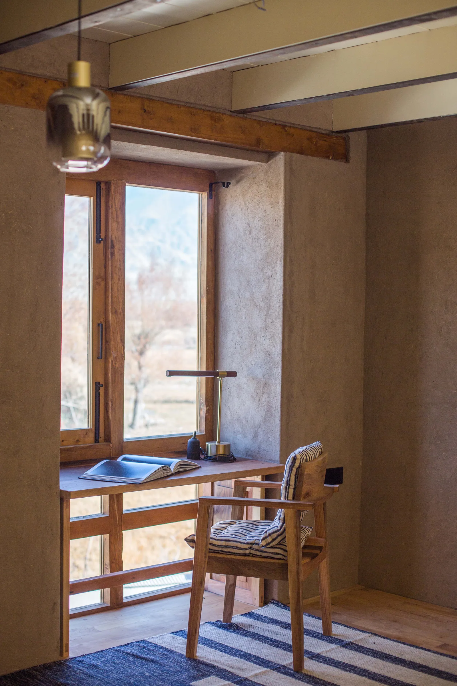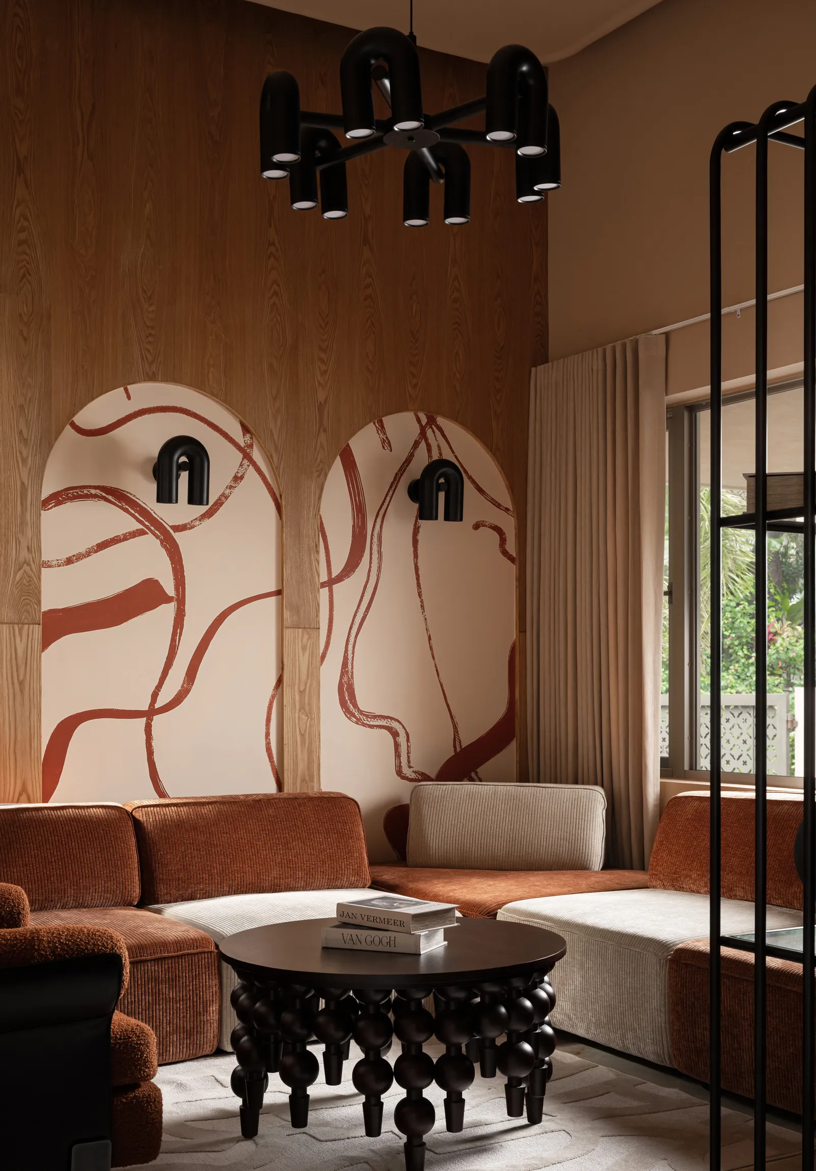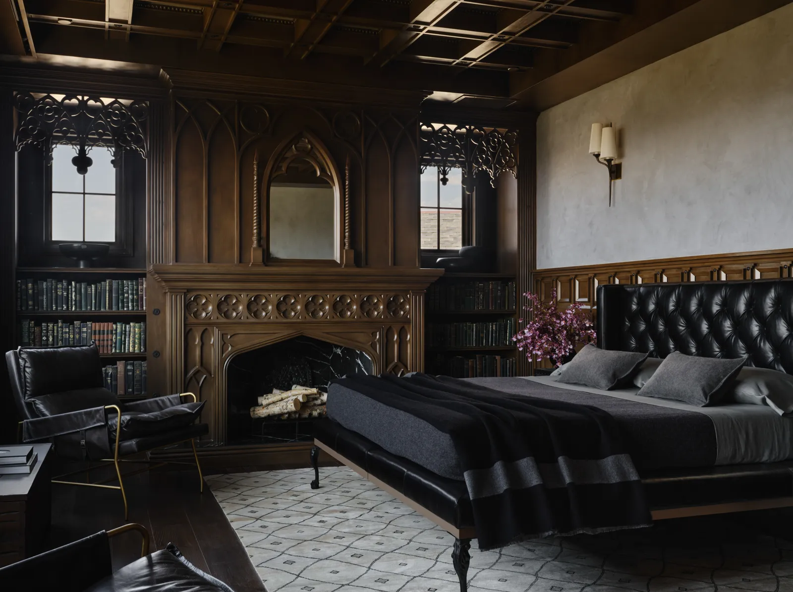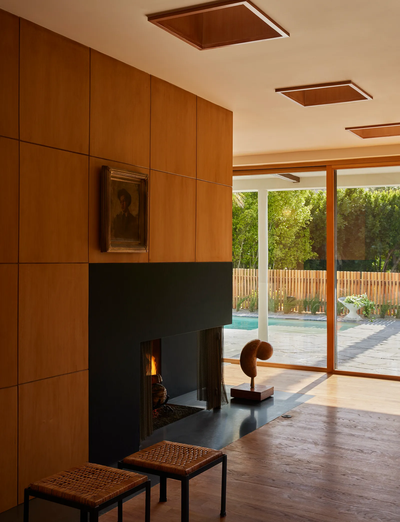 Kaynak: Bodrum katındaki TV odasında tavan pervazları ve tavan Farrow & Ball Stiffkey Blue rengiyle kaplanmışken, duvarlar Romo Sisal Ocean duvar kağıdıyla sarılmış. 1st Dibs'ten alınan Silvio Piattelli Sistema Solare 6 Döner Orbitale Kollu Avize tavana asılı. Şömine çevresi Calcatta Viola mermeriyle kaplanmış, özel yapım kanepe Yarn Collective'den tarçın rengi kumaşla, özel yapım puf ise Falconetto Spice kumaşla kaplanmış. Kate Martin Photography