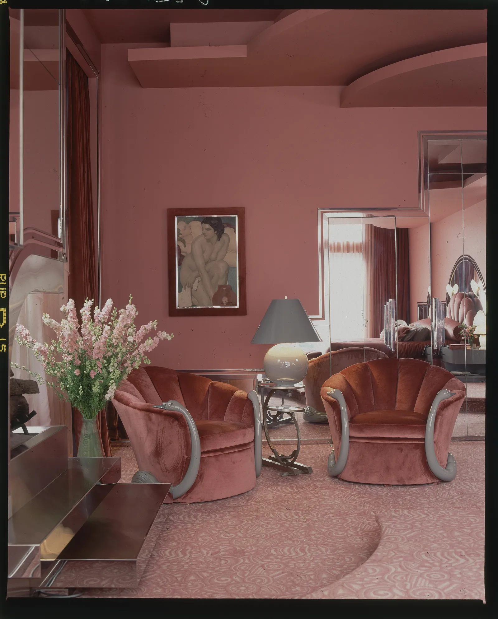 Kaynak: Oyuncu, şarkıcı ve yönetmen Barbra Streisand'ın Kaliforniya, Malibu'daki mülkündeki konuk evinin yatak odasının bir köşesi. Art Deco tarzı sandalyeler, pembe kadife döşemeli kuğu motifine sahip; pembe halı ve duvarlar da aynı renkte ve sandalyelerin üzerindeki duvarda iki çıplak kadının resmi bulunuyor. *** Yerel Açıklama *** John Vaughan