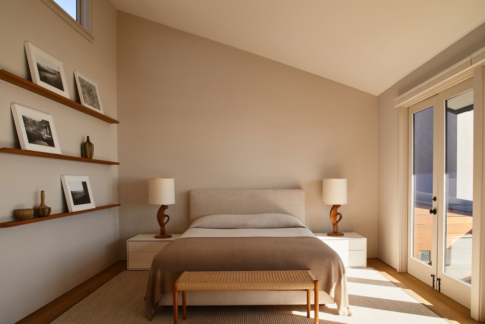 Statham, Danimarka 50'den gelen lambalar ve siyah-beyaz fotoğraf tutan tik raflarla desteklenen huzurlu yatak odası, eğimli çatıyı sahile bakan küçük bir balkona açılıyor, parlama olmadan mutlu bir görünüm, Statham şöyle diyor: “Eğimli çatı neredeyse bir beyzbol şapkasının zirvesi gibi tüm pencerelerde inanılmaz bir gölge yaratıyor ve süslü güneşlikler ve pencere tedavileri yapmanıza izin vermiyor. ”